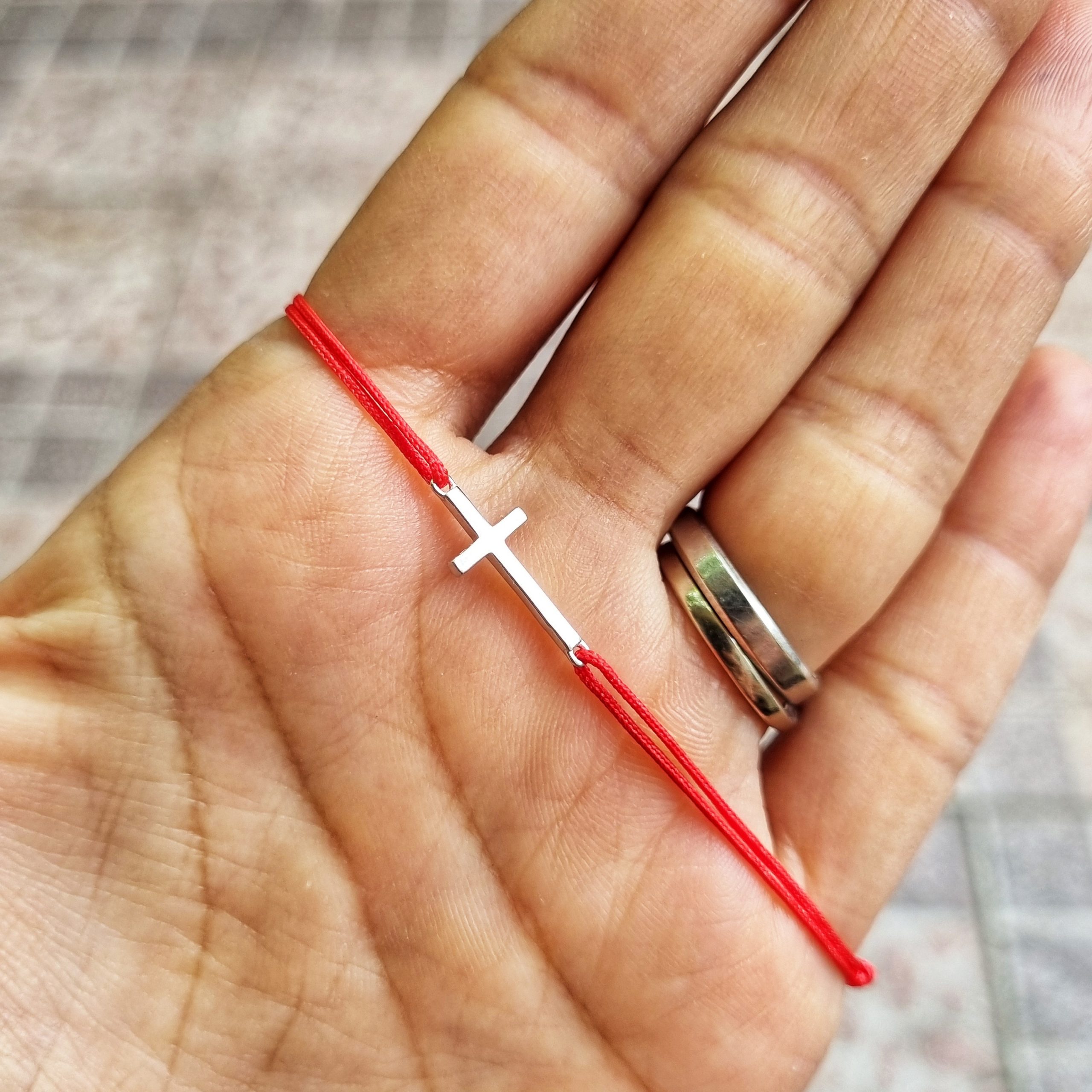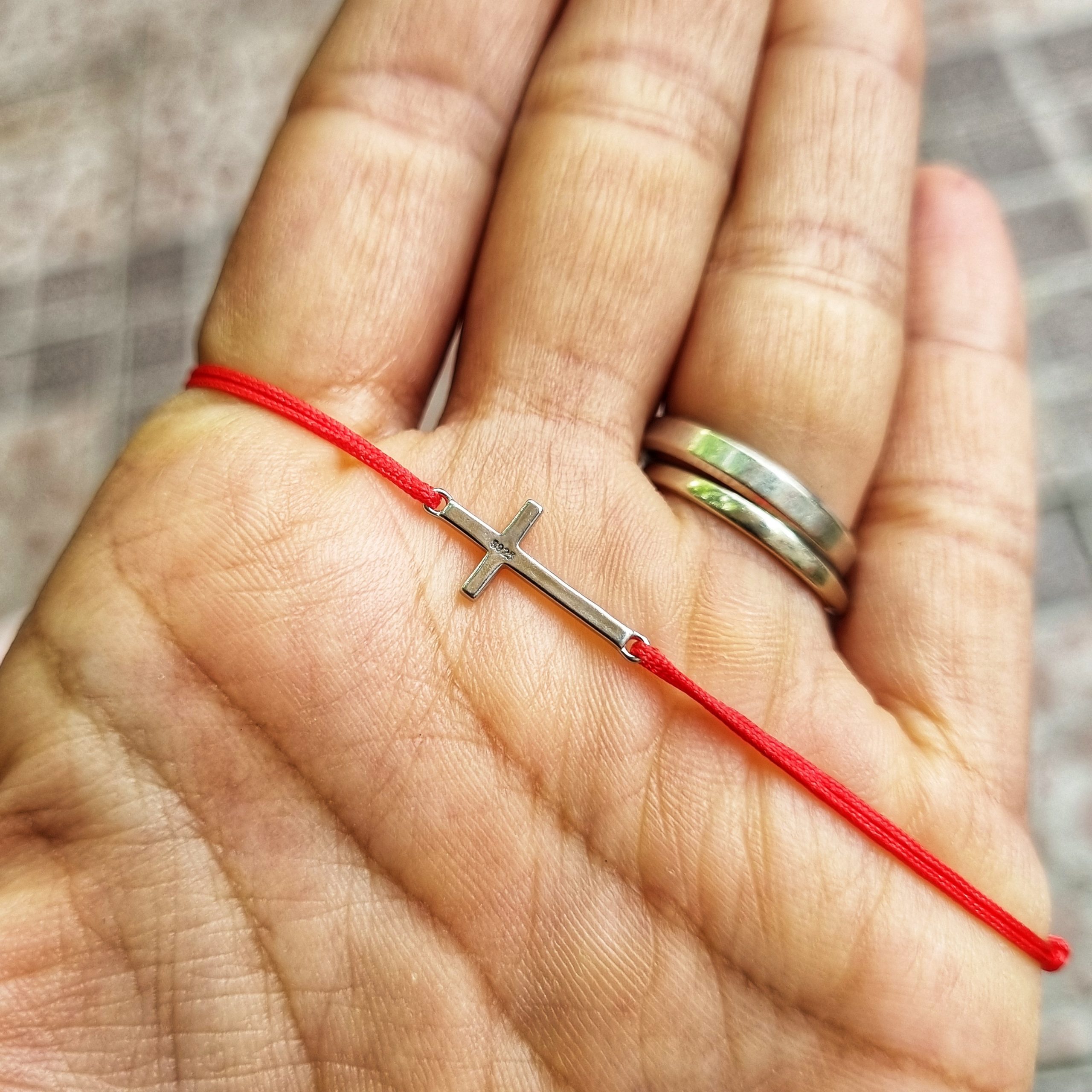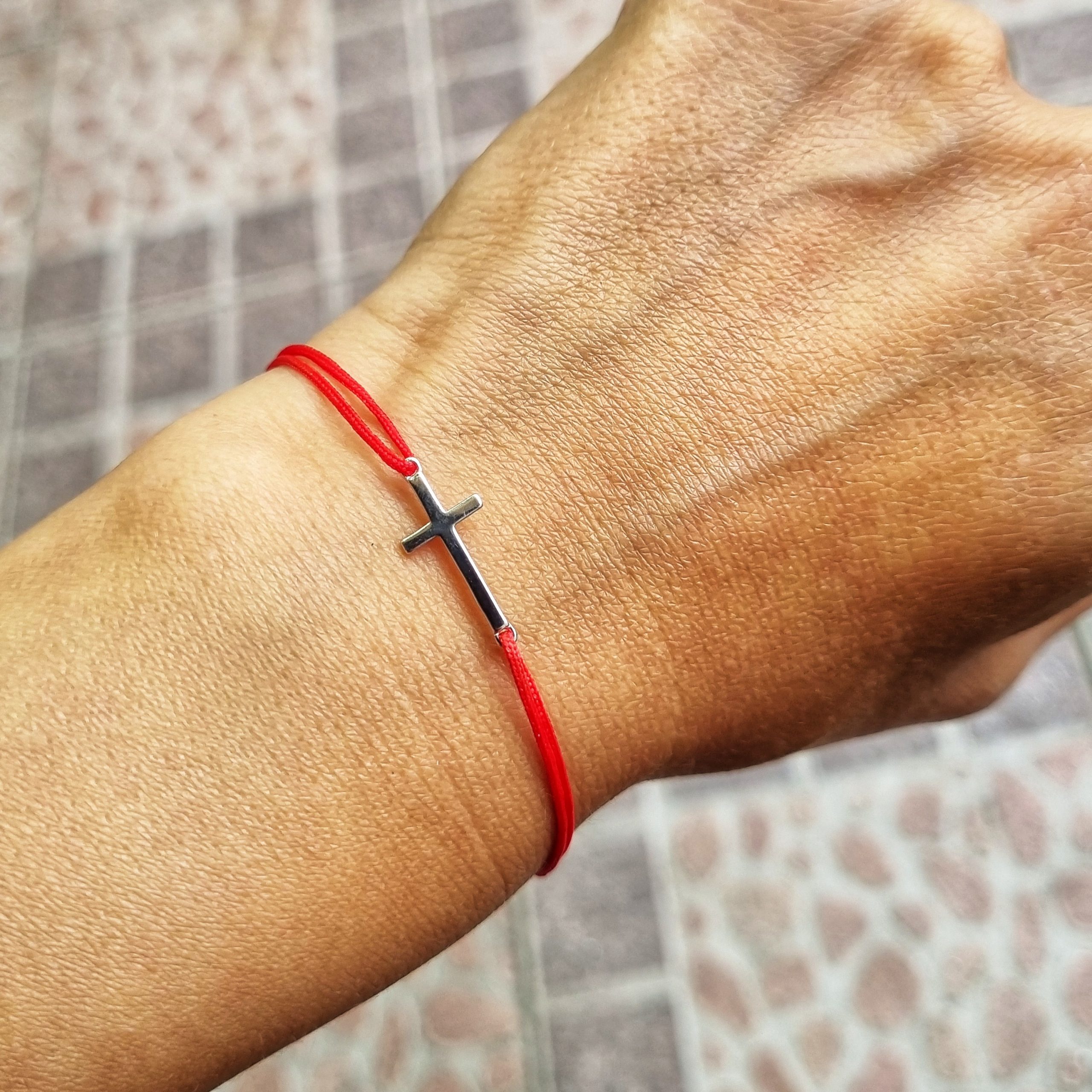 Bratara reglabila din snur de matase cu noduri reglabile si charm Cruciulita din Argint 925. Charmul are ca si lungime 1,8 cm.