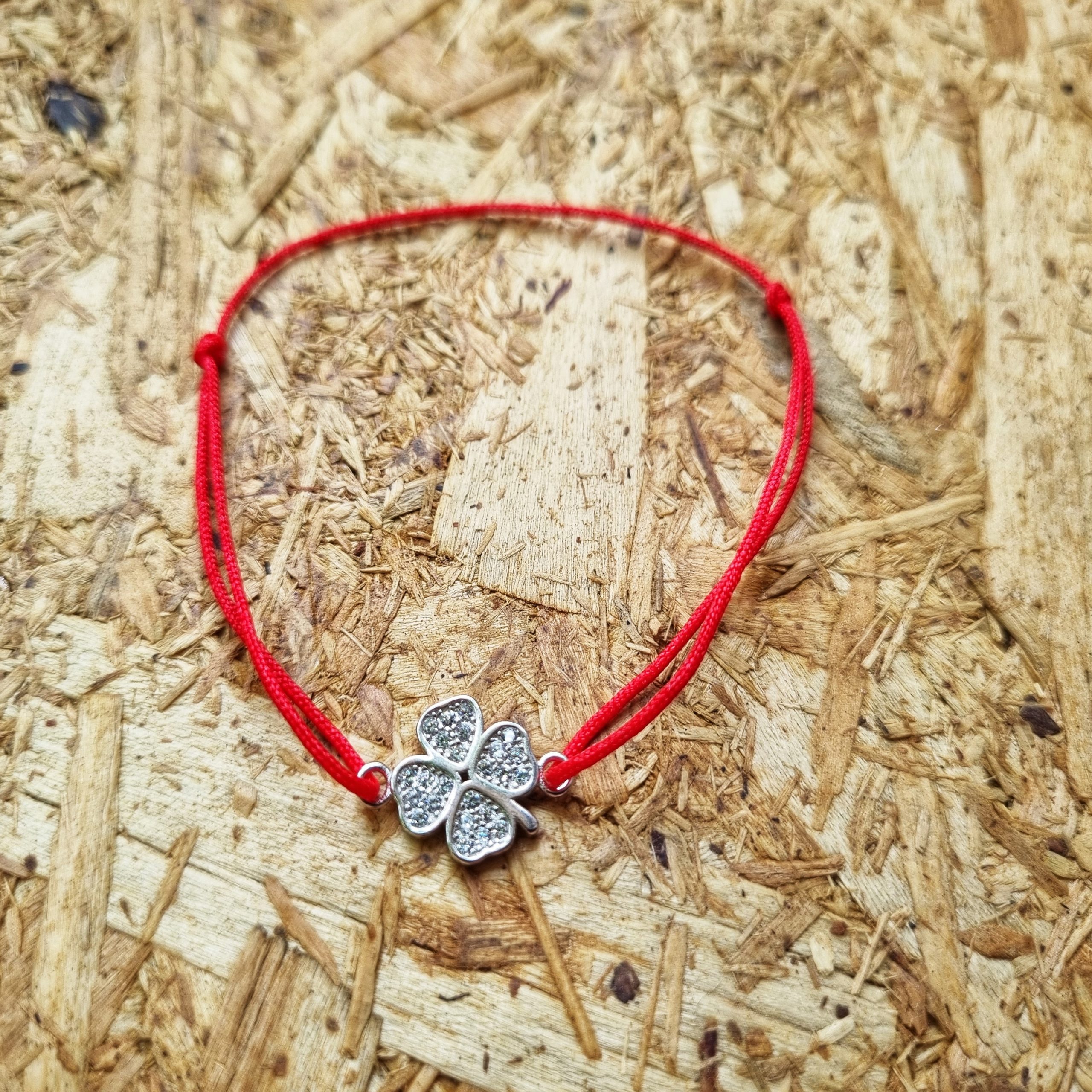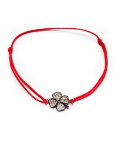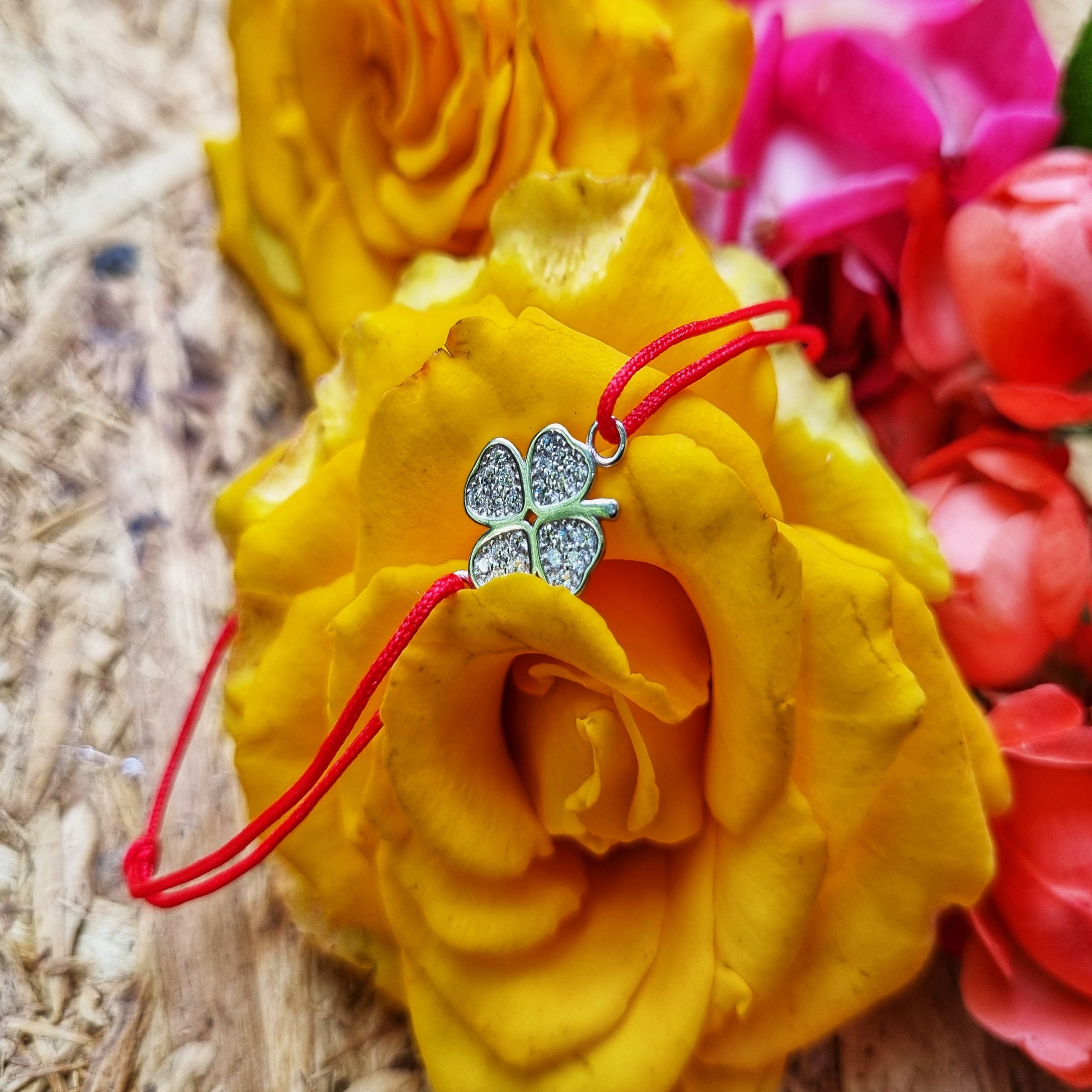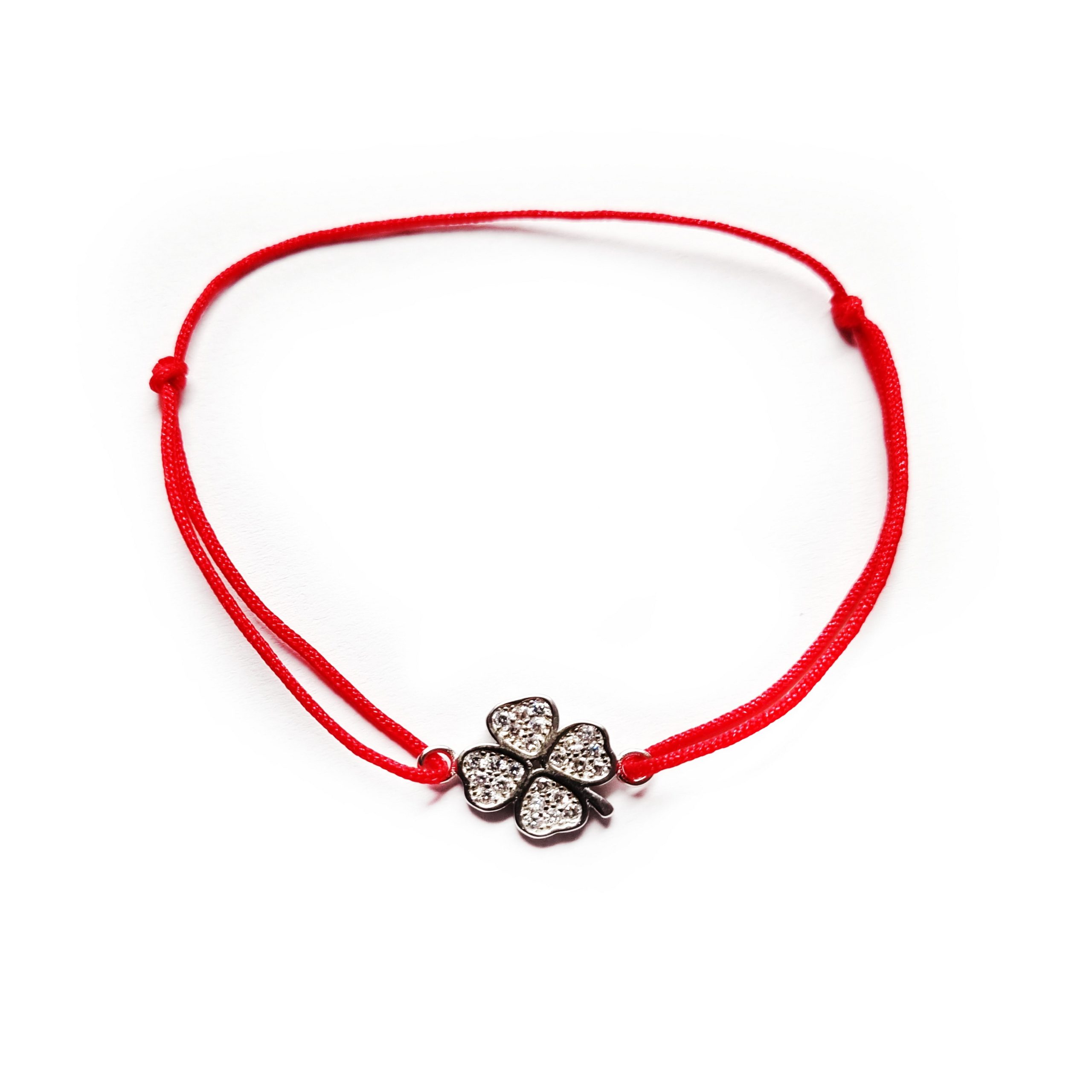 Bratara reglabila din snur de matase cu noduri reglabile si charm trifoi cu cristale zirconia din Argint 925. Charmul are ca si lungime 1,5 cm.