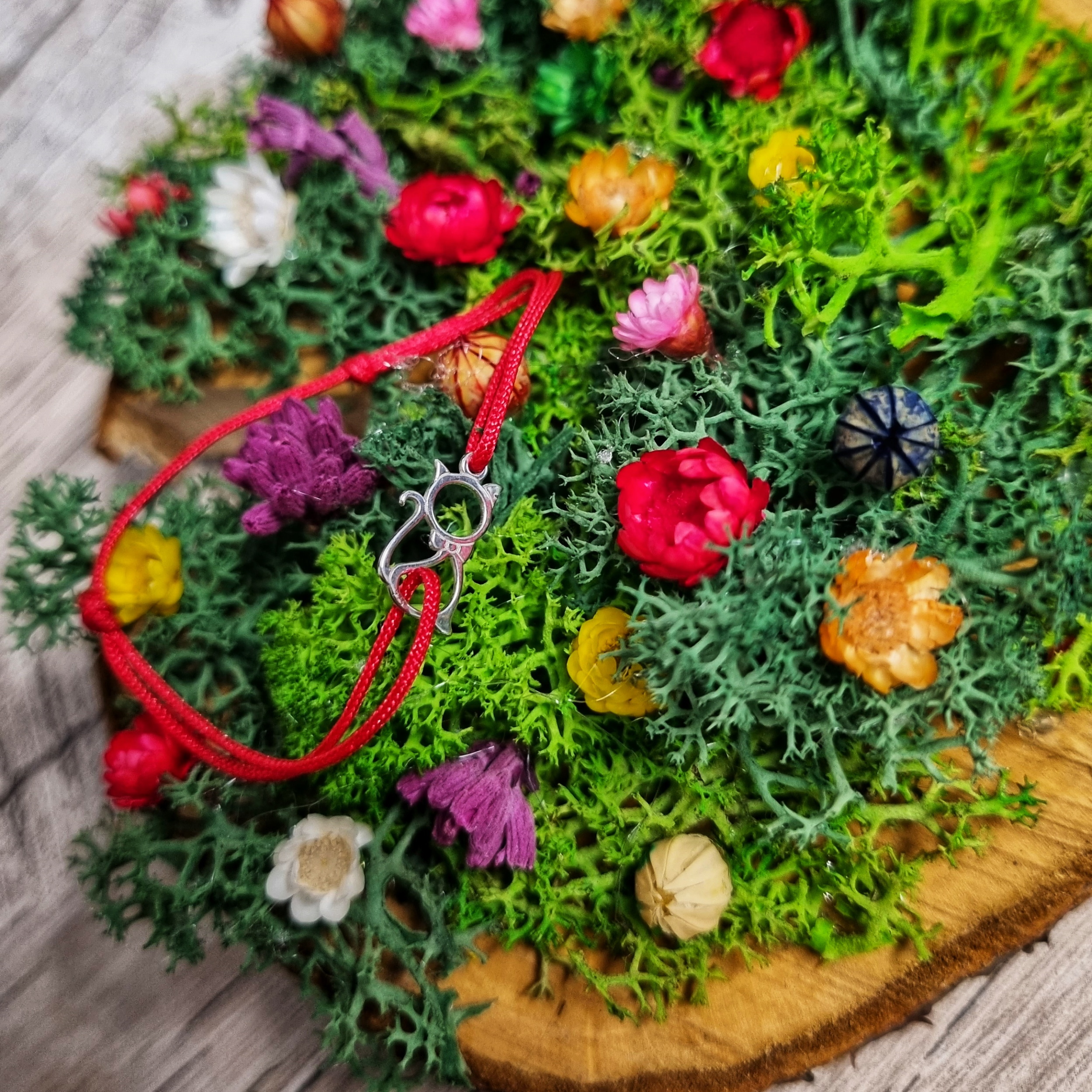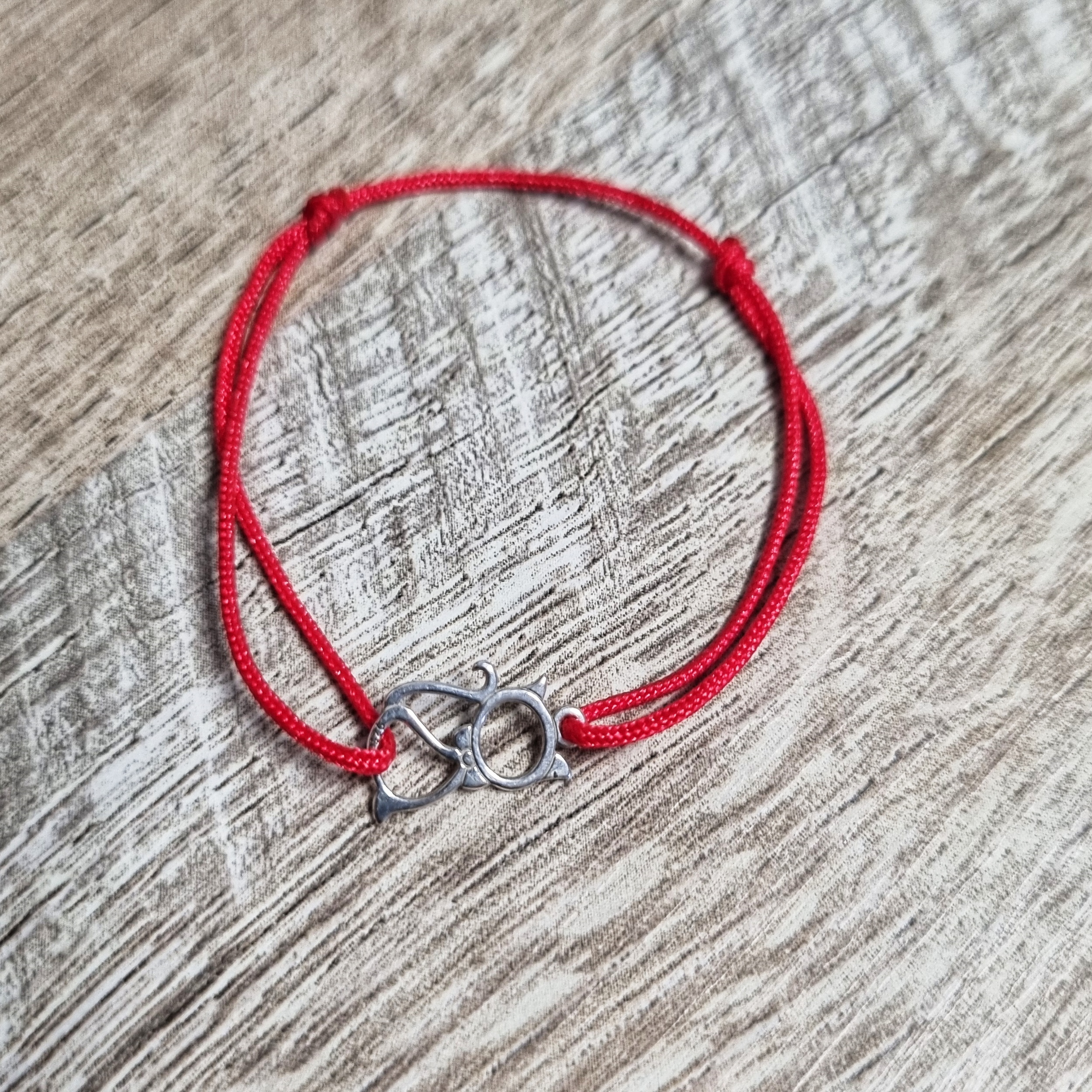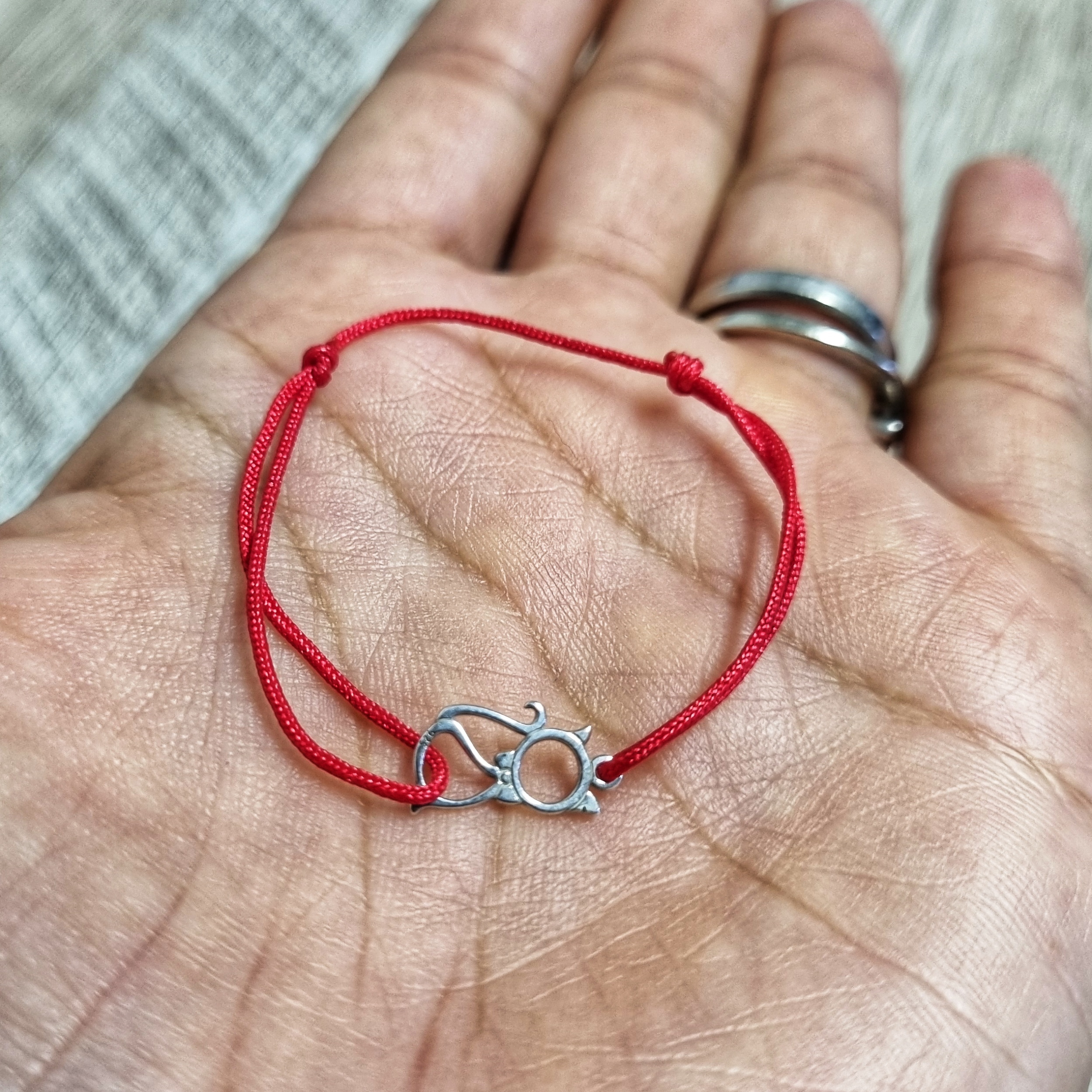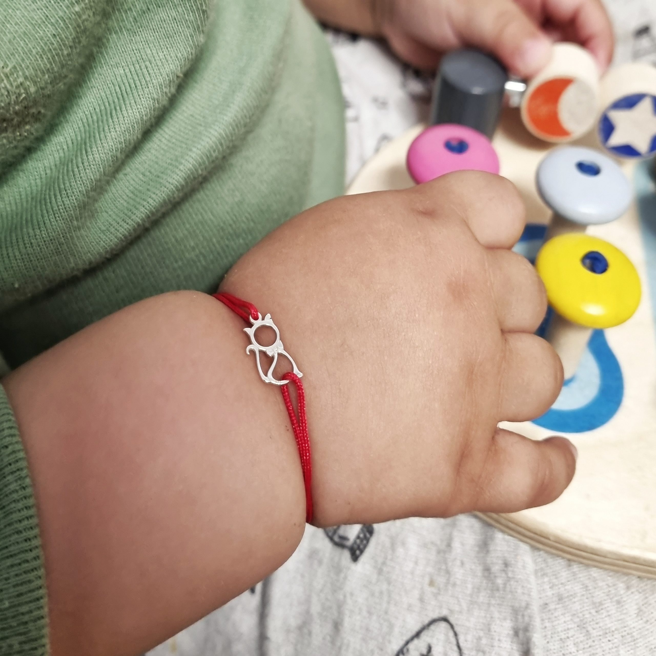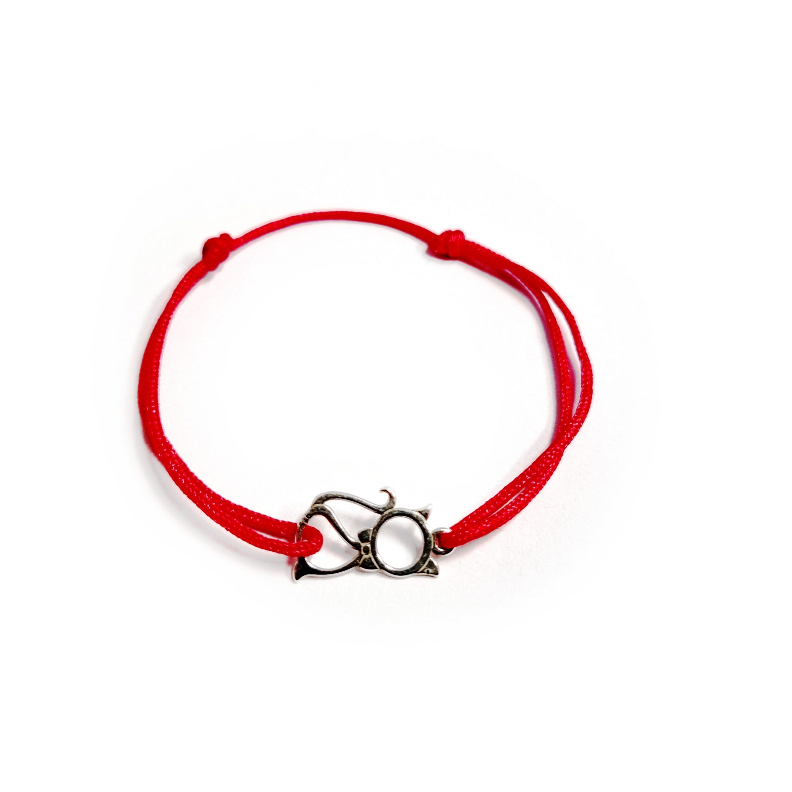 Bratara bebe reglabila din snur de matase cu noduri reglabile si charm Pisicuta din Argint 925. Charmul are ca si lungime 12,5 mm