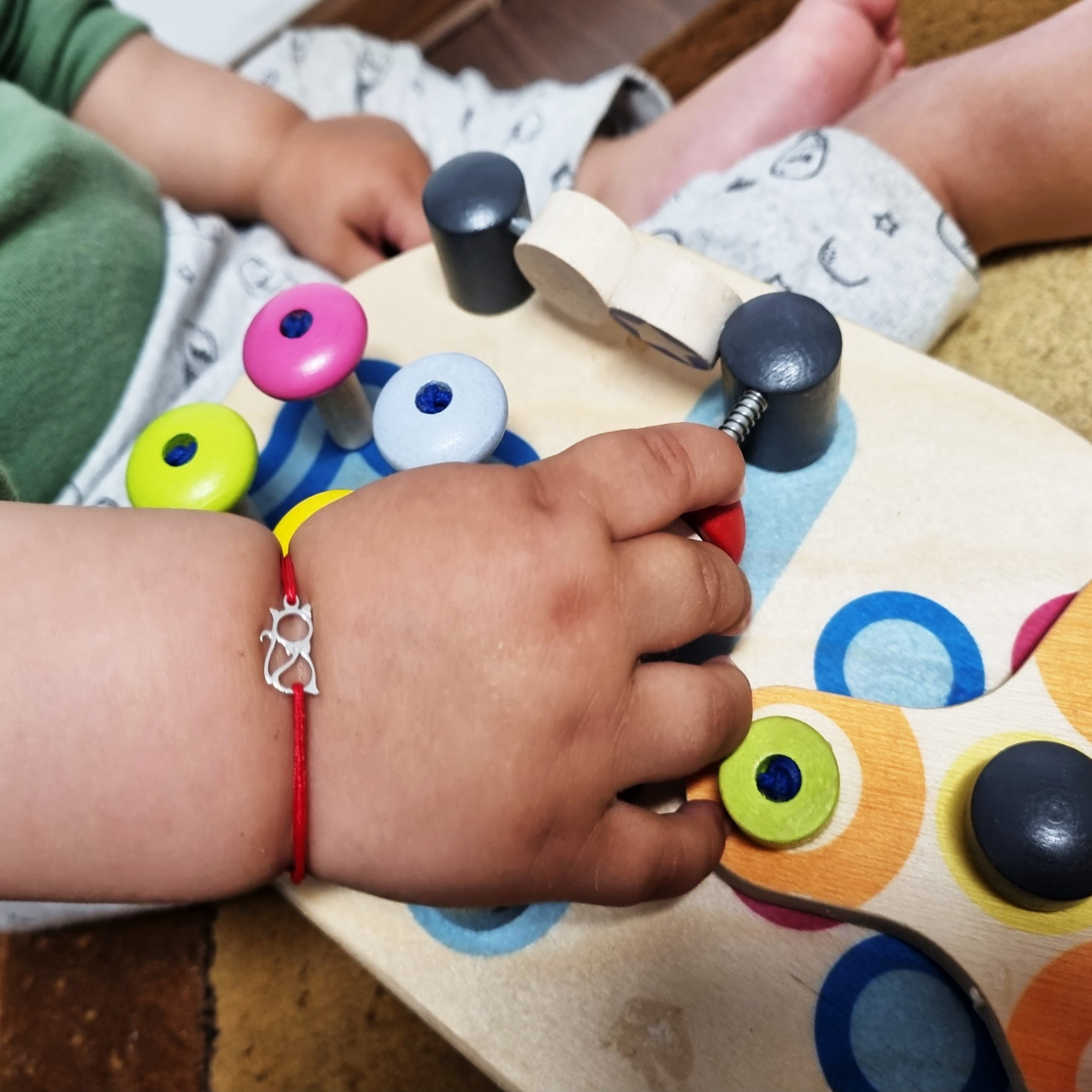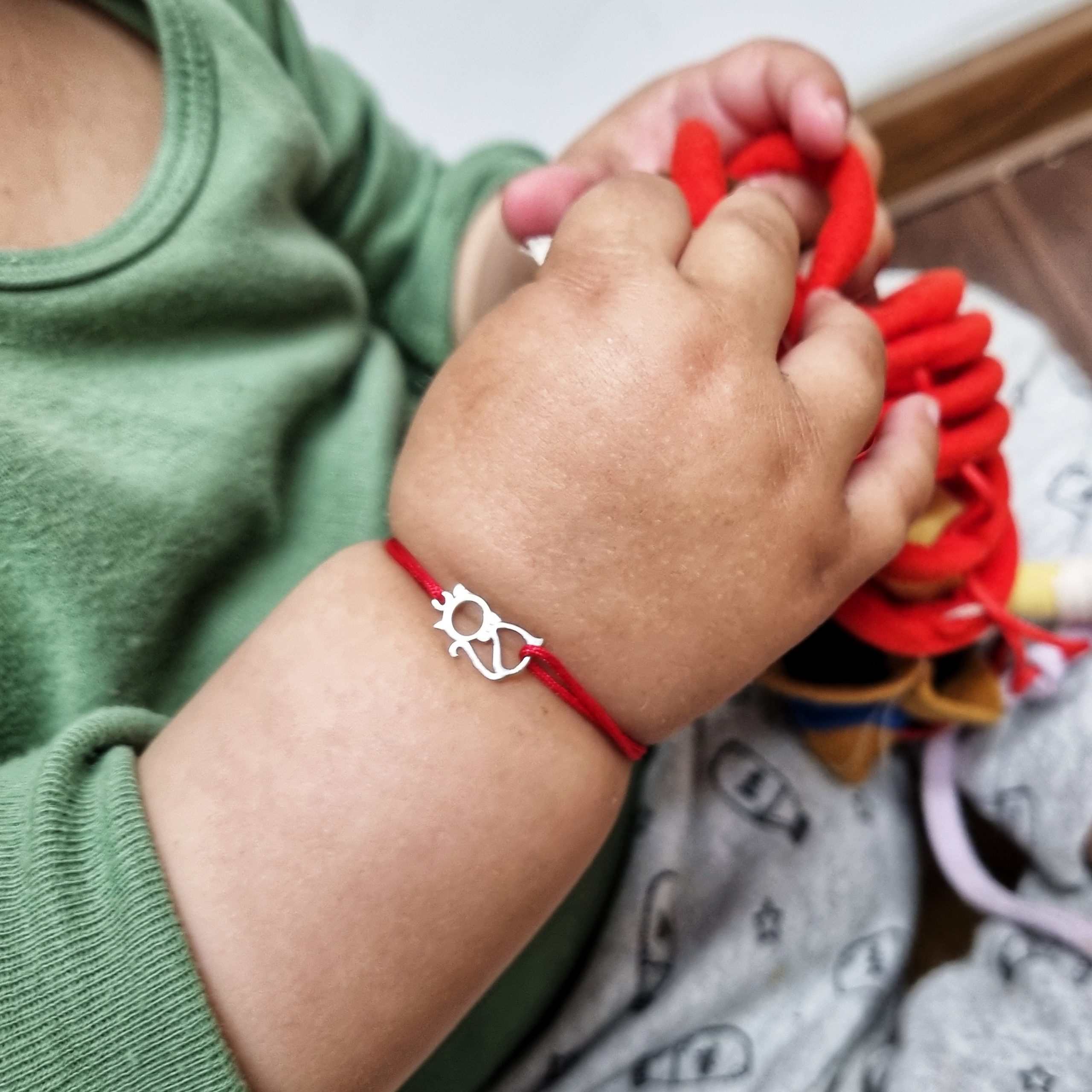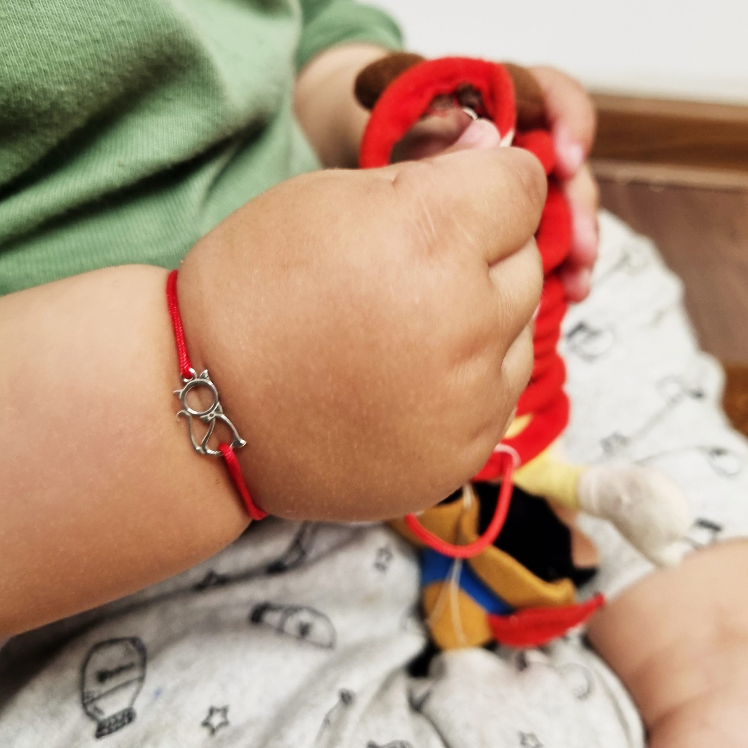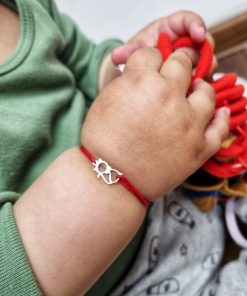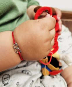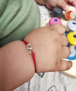 Bratarica este realizata manual, cu noduri ce culiseaza astfel permitandu-i bratarii sa se mareasca sau sa se micsoreze in functie de nevoile celui mic. Este perfecta pentru bebelusi si pentru copilasi mai mari.