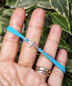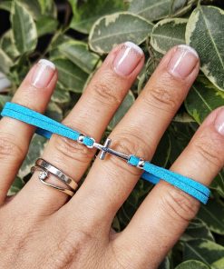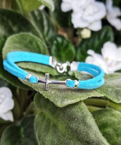 Bratara din piele intoarsa eco, turcoaz, lucrata manual cu charm cruciulita.
