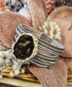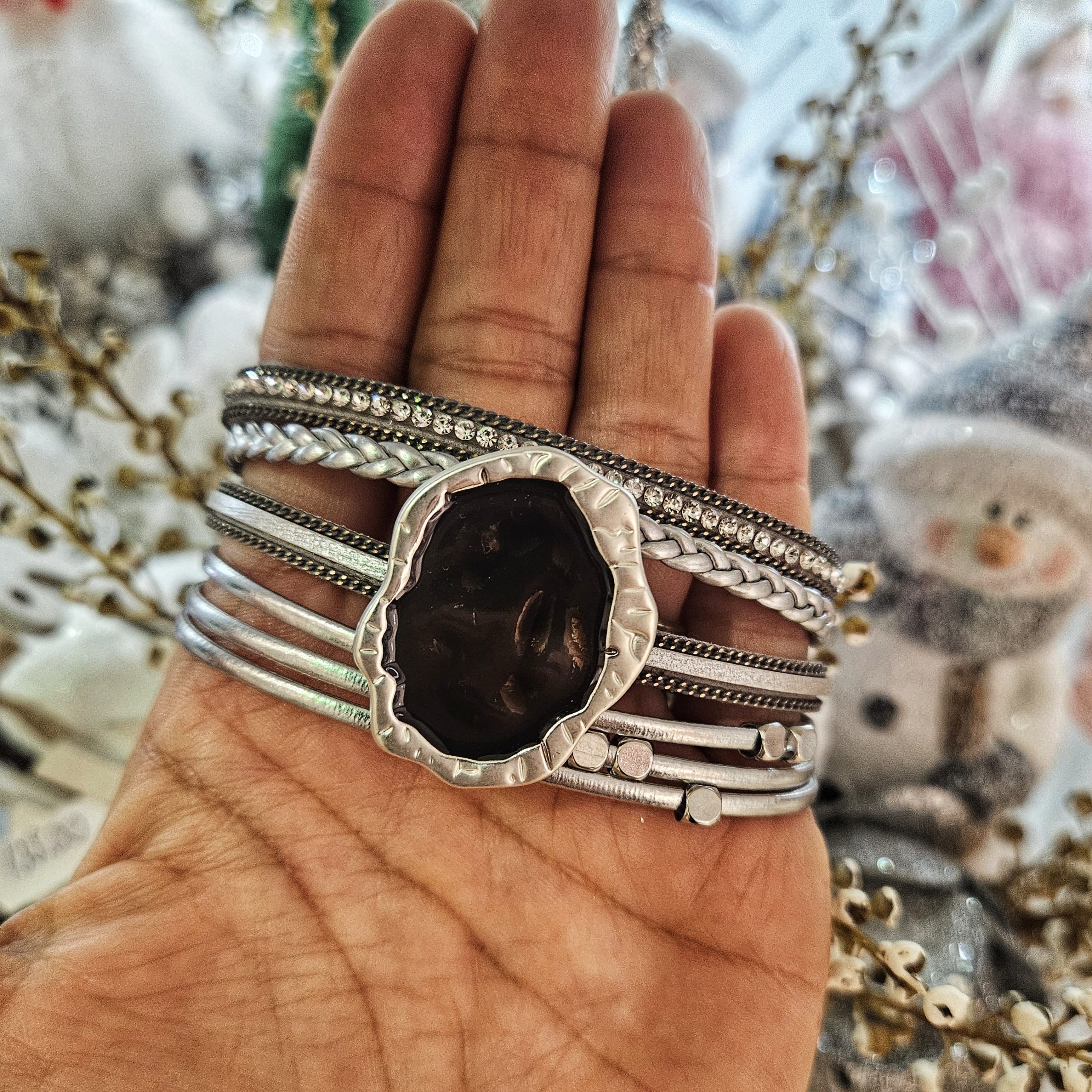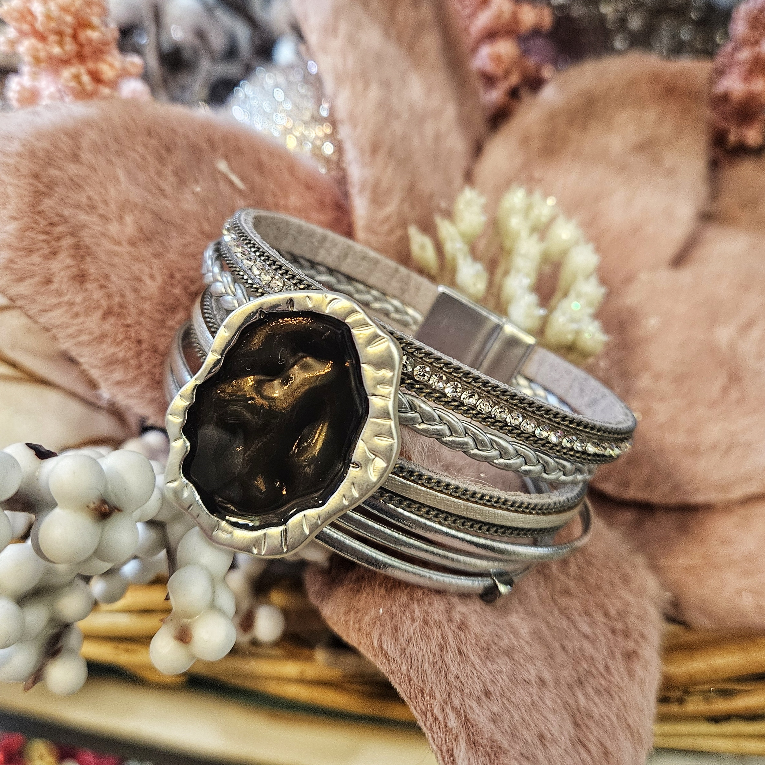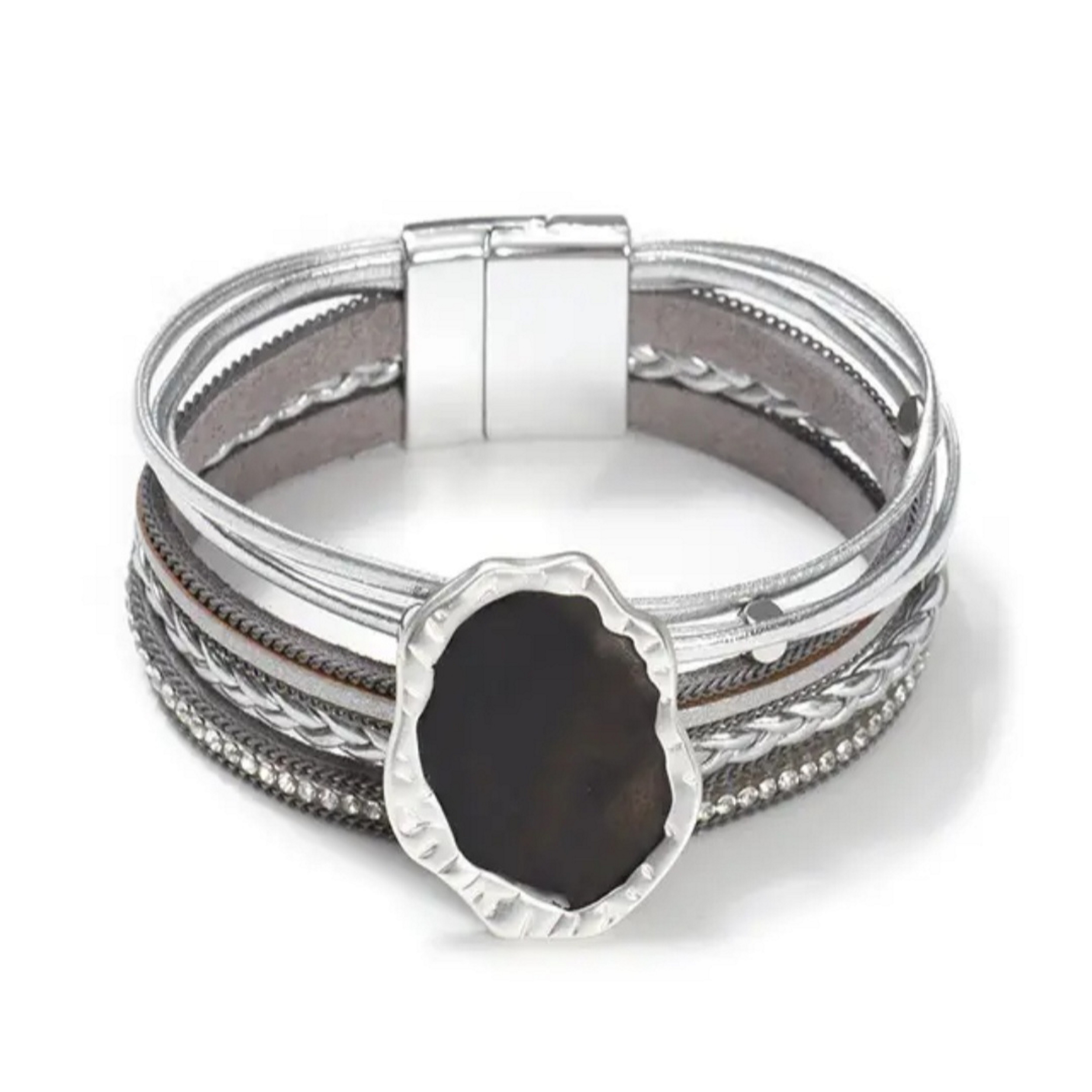 Bratara din piele naturala, realizata din mai multe fasii de piele cu accesorii argintii si accesoriu statment cu rasina epoxidica