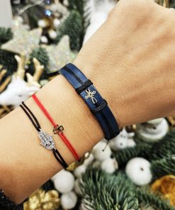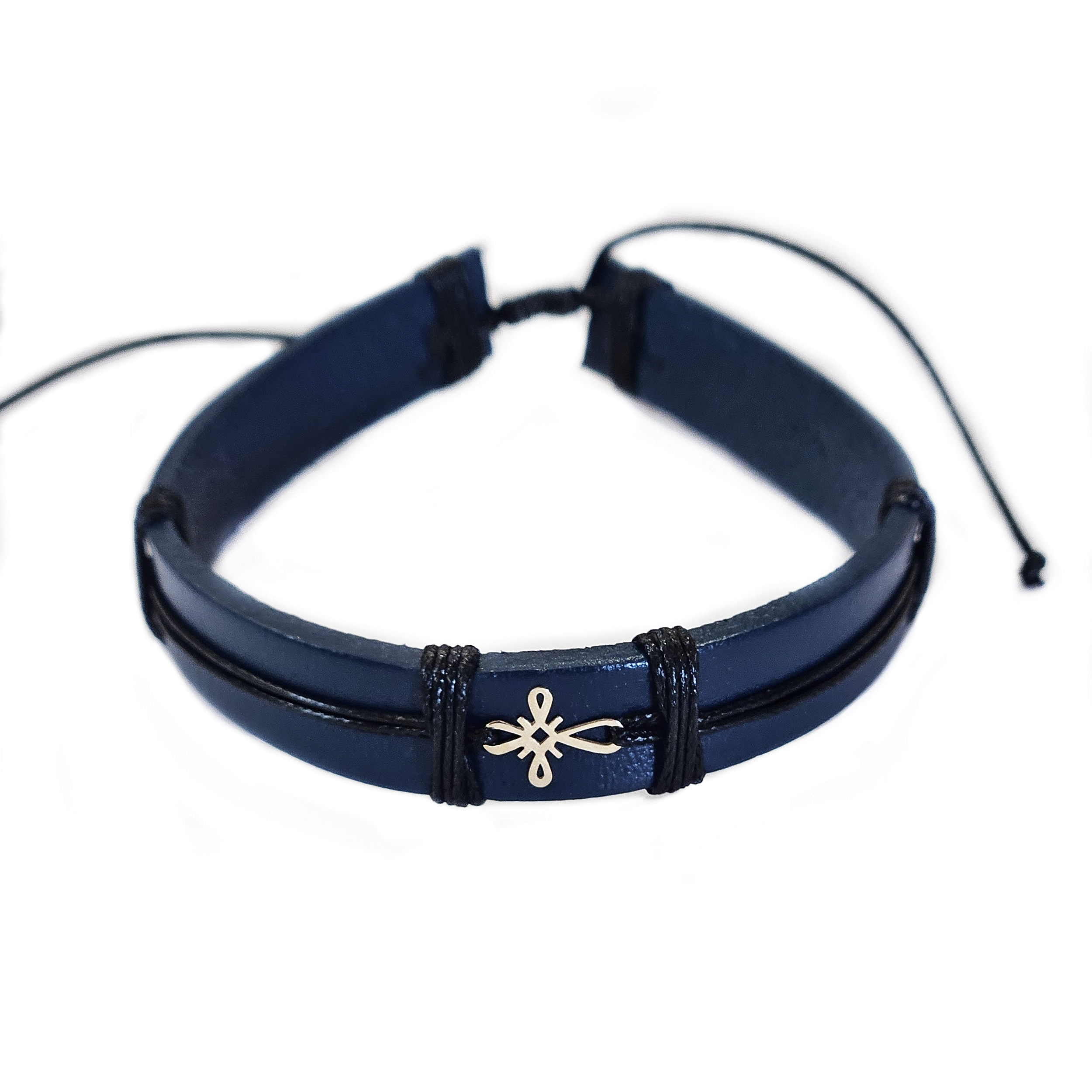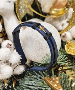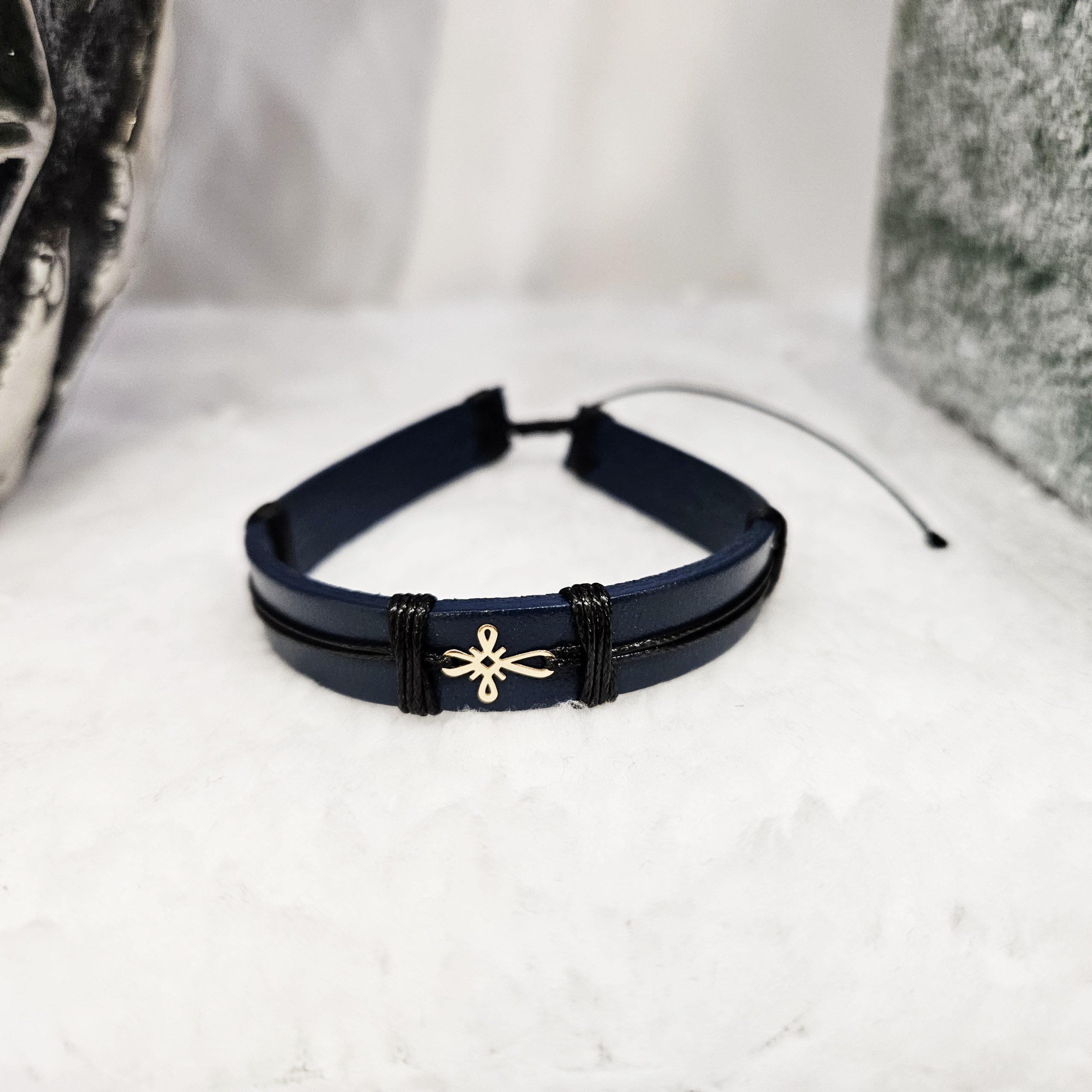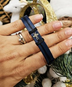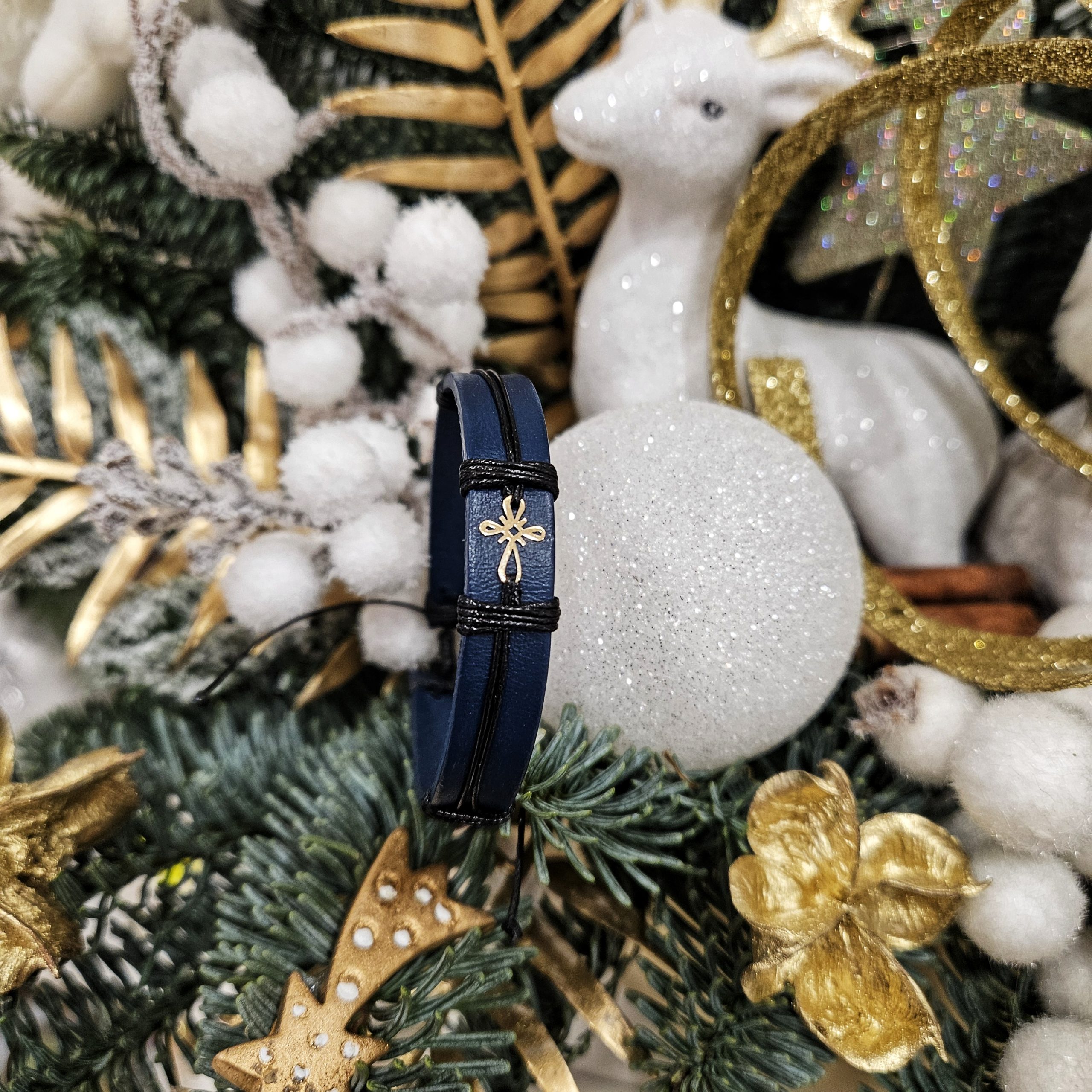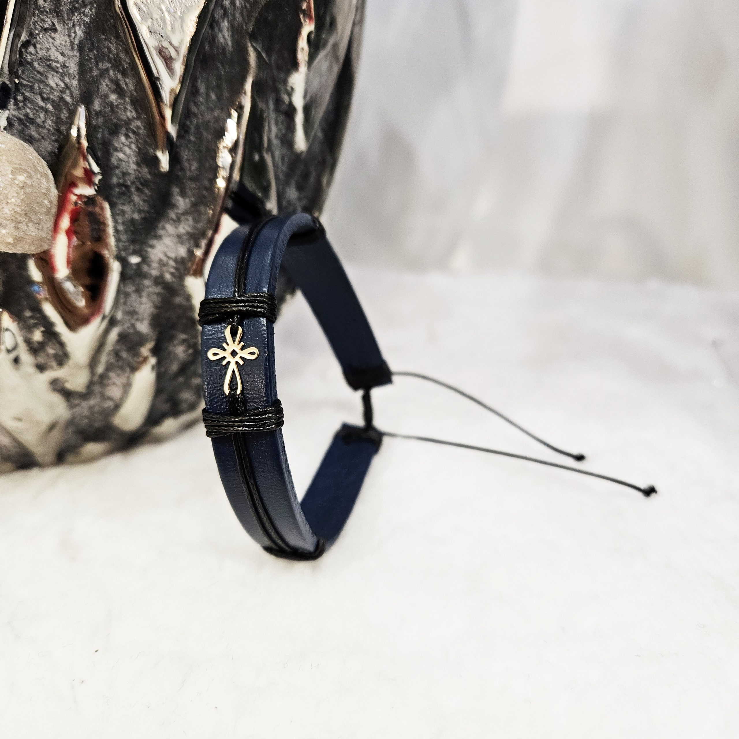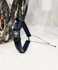 • Bratara din piele naturala albastru inchis lucrata 100% manual, cu charm din Aur de 14k in forma de Cruciulita, regalbila pentru orice incheietura.