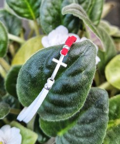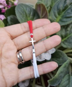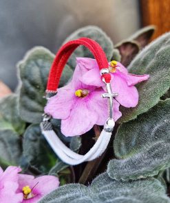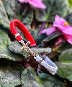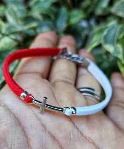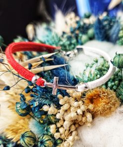Bratara este din piele intoarsa eco din categoria bijuteriilor simbol. Este realizata manual cu accesoriu decorativ argintiu decorat cu charm cruciulita si snur de piele intoarsa, plus o lungime de lantisor din inox de 3cm